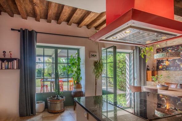 Arranged over three levels, the home benefits from underfloor geothermal heating on the ground floor and reversible air conditioning upstairs, ensuring year-round comfort. The separate, fully fitted kitchen reflects the same attention to quality and tradition found throughout. Both the interior and exterior are in excellent condition, with a well-maintained tiled roof and a rendered facade that add to the overall elegance.